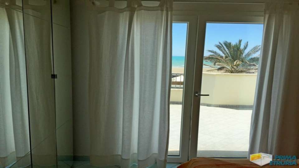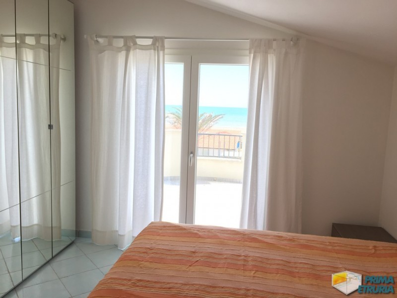 A MARINA DI GROSSETO IN VIA LUNGOMARE LEOPOLDO , A CIRCA 20 METRI DALLA SPIAGGIA , IN ZONA ROSMARINA , PROPONIAMO IN AFFITTO BELLISSIMO ATTICO FRONTE MARE SU DUE LIVELLI , POSTO AL PIANO PRIMO DI UNA ELEGANTE PALAZZINA DI RECENTE COSTRUZIONE . APPARTAMENTO COMPOSTO DA SOGGIORNO LIVING CON DIVANO LETTO MATRIMONIALE , CUCINOTTO , SALA DA PRANZO , BAGNO DI SERVIZIO E UNA VERANDA VISTA MARE ATTREZZATA CON TAVOLO E SEDIE ; SCALA INTERNA PER ACCEDERE AL PIANO SUPERIORE COMPOSTO DA BAGNO E DUE CAMERE MATRIMONIALI UNA DELLE QUALI SERVITA DA AMPIA VERANDA SOLARIUM CON UNA BELLISSIMA VISA SUL MARE . DOTATO DI TV , LAVATRICE E ARIA CONDIZIONATA . ARRIVO SABATO ORE 17:00-19:30 / PARTENZA ORE 08:00-10:00 . ANIMALI NON AMMESSI . COSTI AGGIUNTIVI : PULIZIE FINALI EURO 120,00